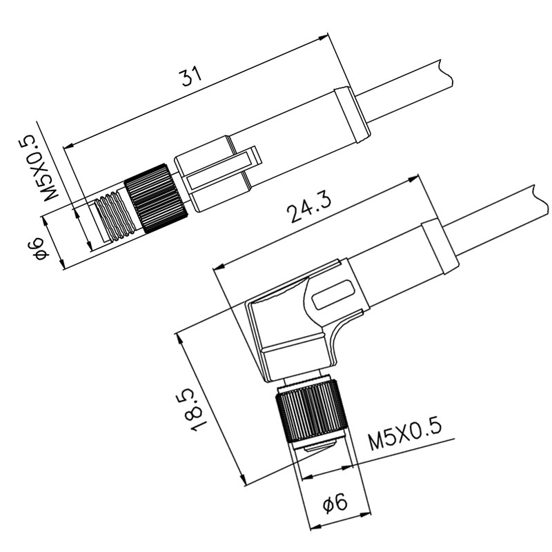 M5 male straight to female 90degree molded A code 3pin 4pin waterproof cable connector